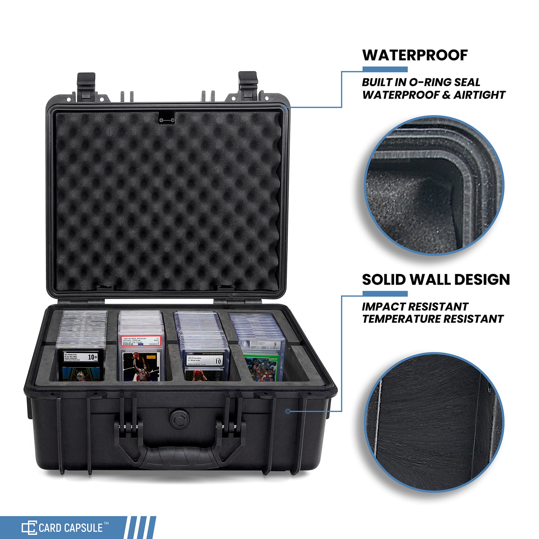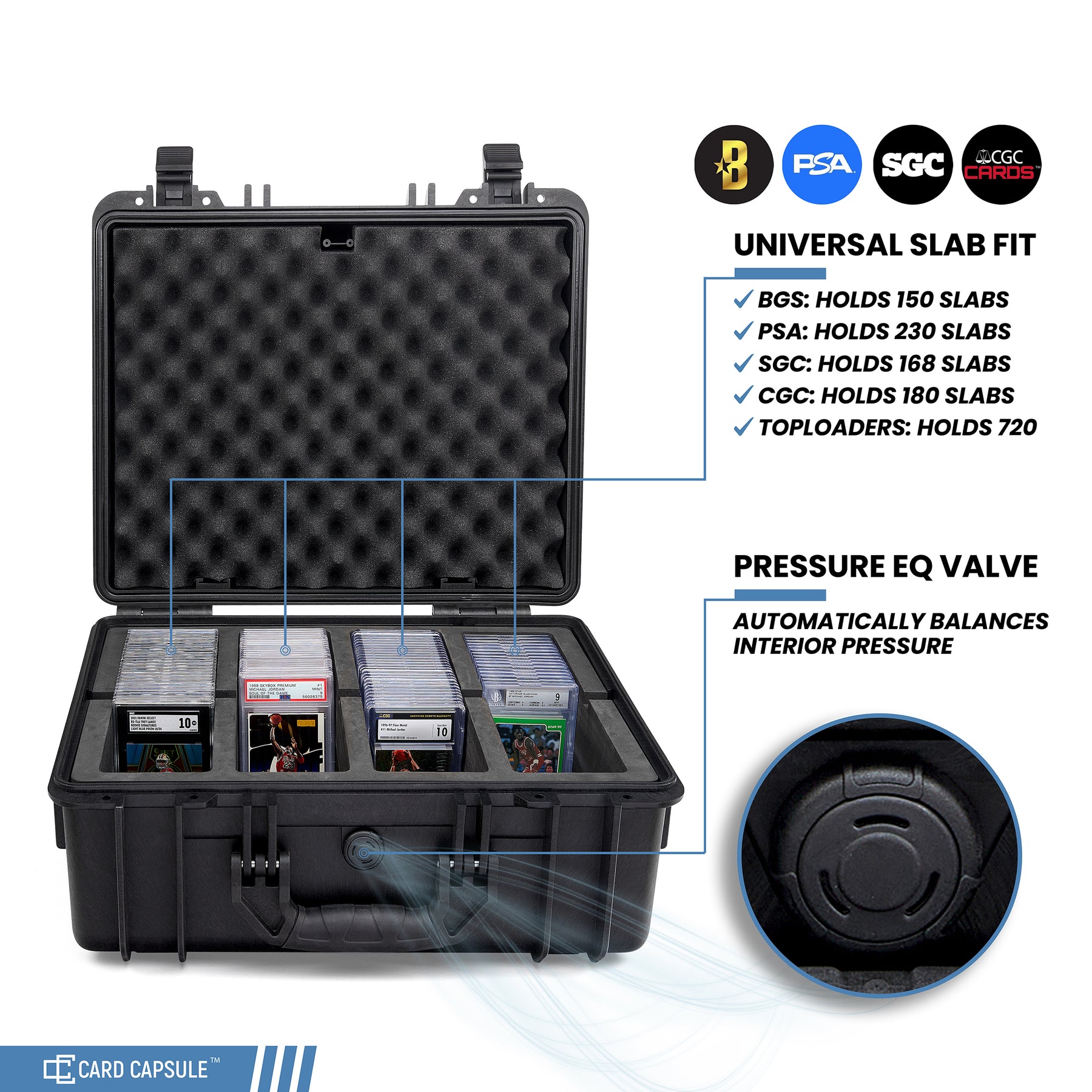 Meet the Card Capsule Pro: Designed with the collector in mind, this weatherproof graded card case seamlessly holds all types of graded cards, including but not limited to PSA, BGS, SGC, CSG, CGC, and HGA. With a generous capacity to store up to 150 BGS or 230 PSA graded cards, this spacious case is ideal for any collector. Constructed of durable, impact-resistant resin, the Card Capsule Pro offers a secure and waterproof solution for protecting your valuable collection. Go ahead and ditch that second-rate case you picked up at harbor freight and purchase one of our PREMIUM QUALITY cases today, your cards will thank you for it.