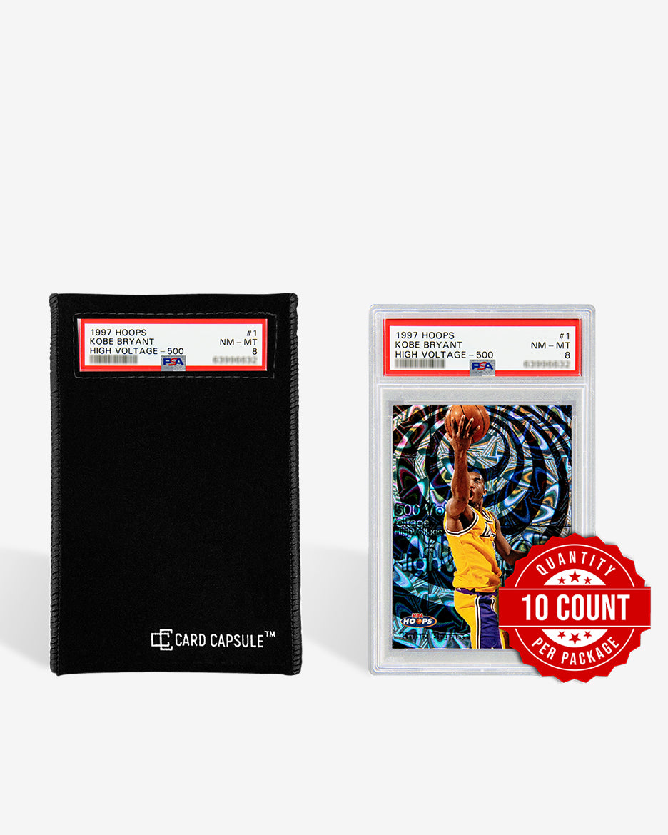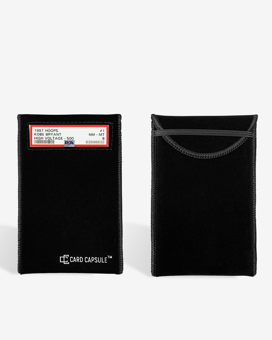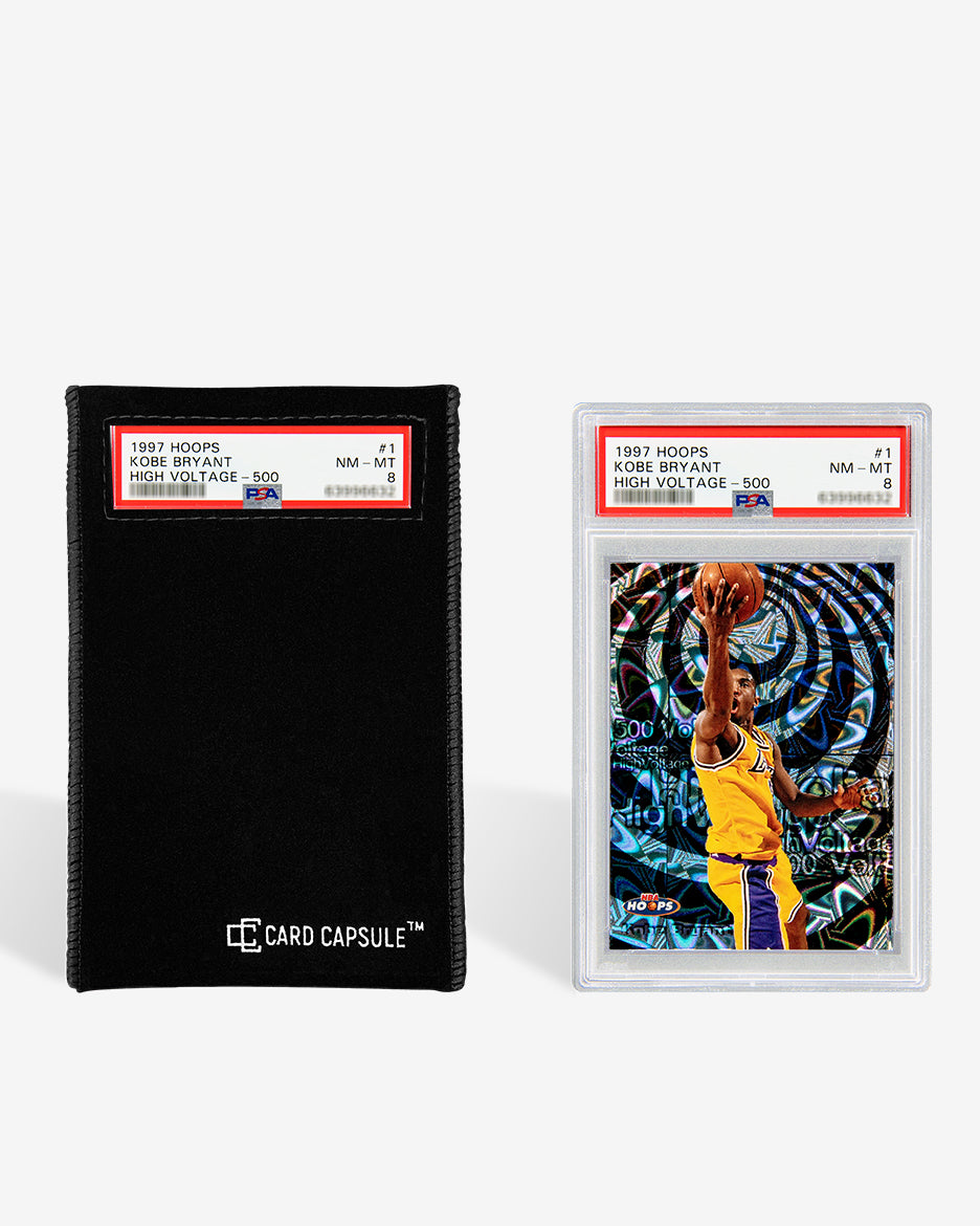 Front and back view showing a Card Capsule Soft Velvet Bag for PSA Cards with a PSA graded 1997 Hoops High Voltage 500 Kobe Bryant Card Inside